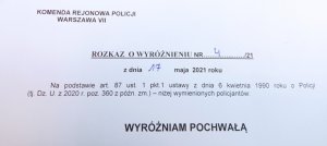 Komendant Rejonowy Policji Warszawa VII wspólnie ze swoim I zastępcą, w obecności naczelników i przy zachowaniu zasad reżimu sanitarnego, wręczyli policjantom wyróżnienia w formie pochwał i urlopów nagrodowych.