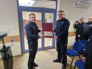 Po zakończeniu odprawy zmieniliśmy charakter i klimat uroczystości i wspominaliśmy ponad 30-letnią służbę dwóch kolegów, którzy właśnie żegnają się z Policją i odchodzą na zasłużoną emeryturę, asp. szt. Robert Urbański po ponad 30 latach, asp. szt. Waldemar Piwowarski po ponad 32 latach.