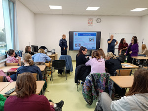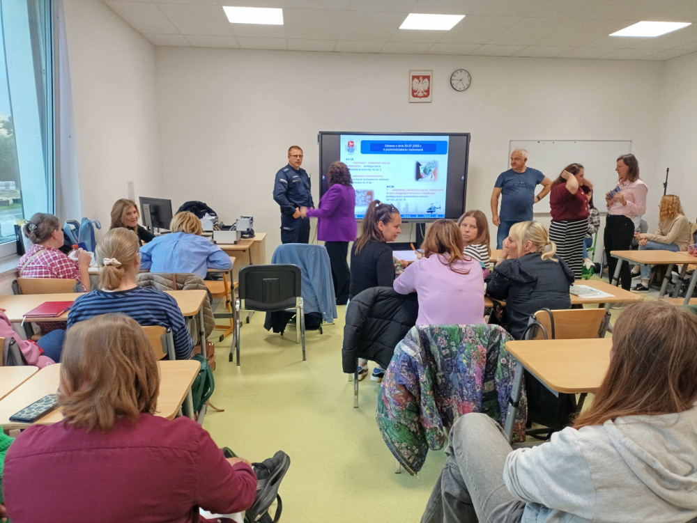 Dzielnicowy z policjantką zajmującą się profilaktyką społeczną przeprowadzili bardzo wartościowe, merytoryczne i do tego też praktyczne zajęcia z kadrą pedagogiczną ze Szkoły Podstawowej nr 402.