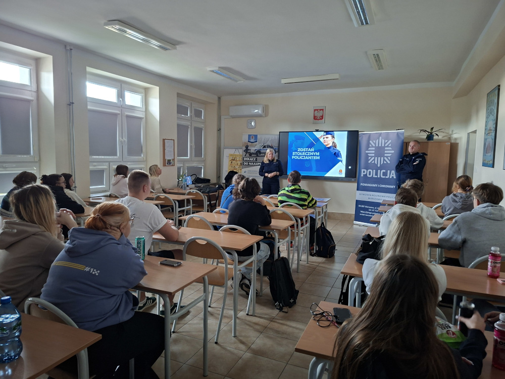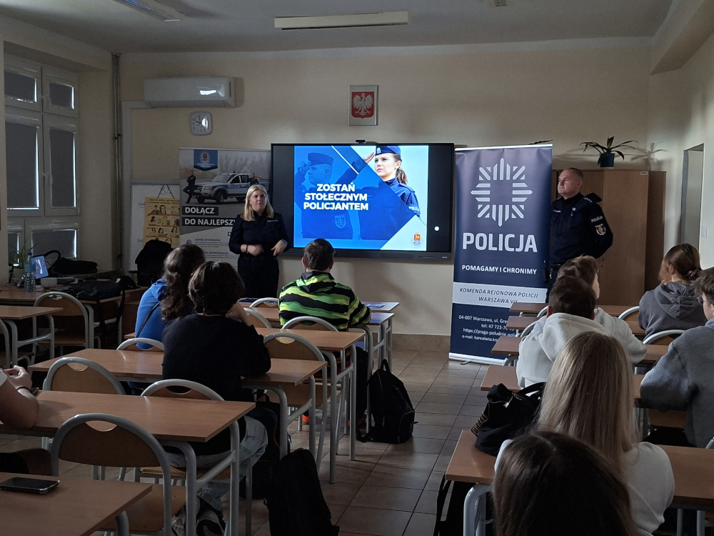 Policjantka z Zespołu Profilaktyki Społecznej zorganizowała spotkanie z licealistami, na którym tematem wiodącym było promowanie zawodu policjanta. Wziął w nim również aktywny udział Naczelnik Wydziału Wywiadowczo-Patrolowego z 27-letni stażem w Policji od początku zawodowo związany z Pragą Południe i pionem prewencji. Bardzo chętnie podzielił się swoimi doświadczeniami, opowiadał o specyfice pracy w patrolówce, a także odpowiadał na pytania uczniów.
