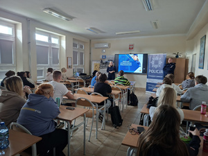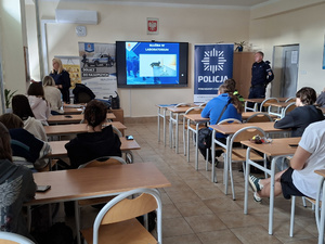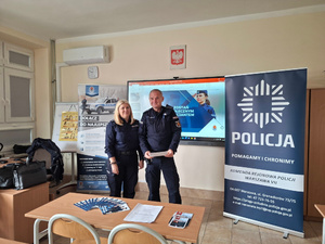 Policjanci zaprezentowali maturzystom wymogi, jakie musi spełnić kandydat na policjanta oraz omówili jak wygląda proces rekrutacji.
