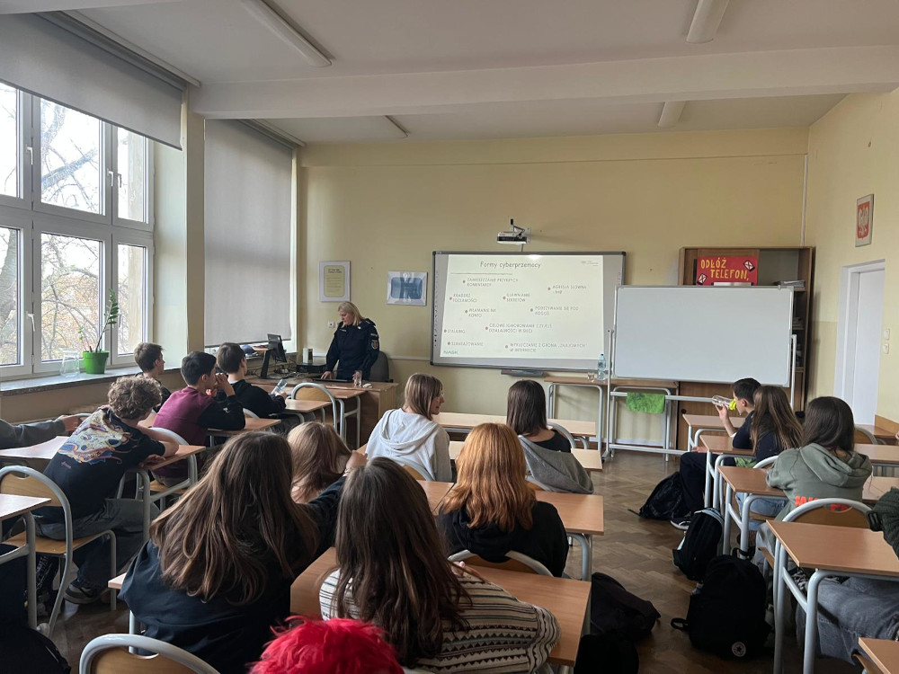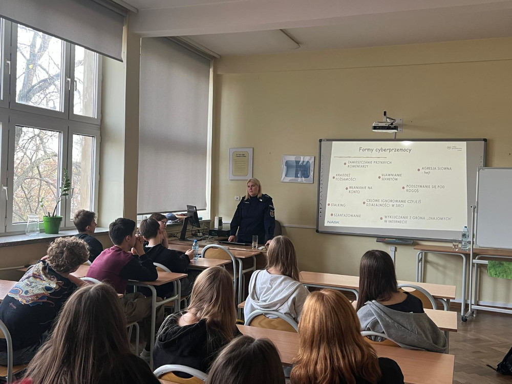 Policjantki zajmujące się profilaktyką społeczną spotkały się z licealistami. Zajęcia dotyczyły odpowiedzialności prawnej nieletnich oraz zagadnień związanych cyberbezpieczeństwem. Profilaktyczki przestrzegały uczniów przed możliwymi zagrożeniami i wskazywały jak skutecznie ich unikać.