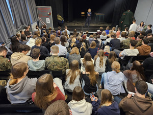 Niewątpliwym atutem spotkania była zajmująca opowieść o policyjnych doświadczeniach funkcjonariusza operacyjnego z Wydziału Kryminalnego z naszej komendy. Policjant opowiedział licealistom o swojej drodze, doświadczeniach, refleksjach, o tym, co sprawiło, że trafił w szeregi Policji i co powoduje, że nadal z pasją pełni tę służbę.