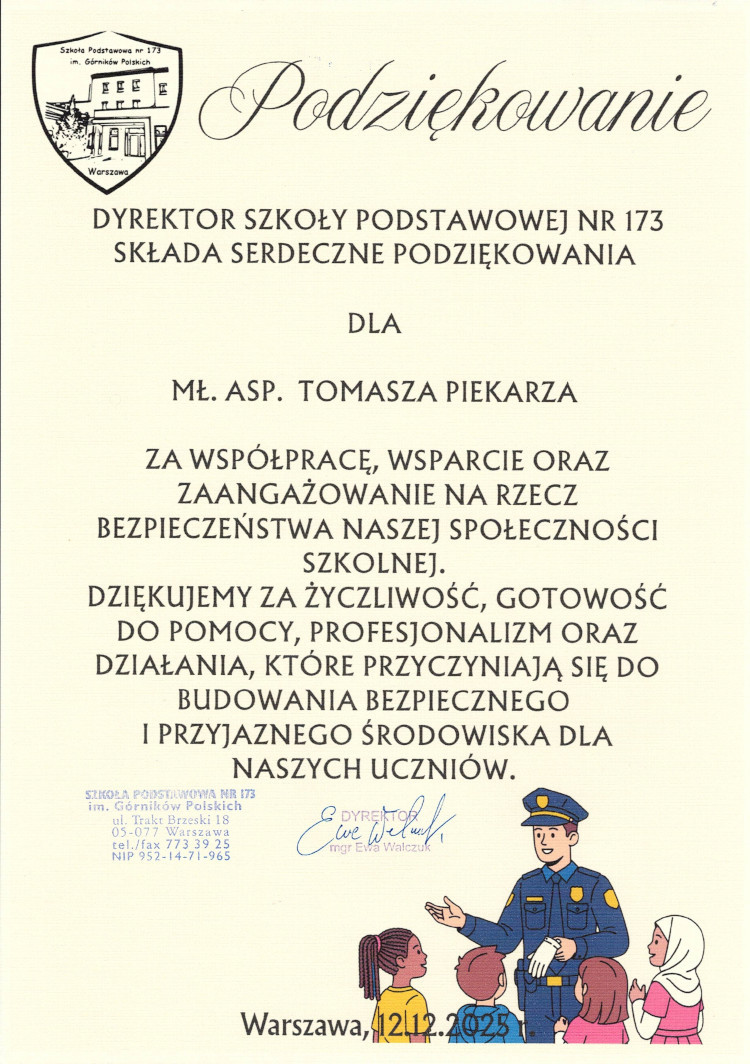 Tym razem dyrekcja jednej ze szkół doceniła współpracę, wsparcie oraz zaangażowanie w działalność zapewniającą bezpieczeństwo społeczności szkolnej. Dzielnicowy, mł. asp. Tomasz Piekarz wykazał się życzliwością, gotowością do niesienia pomocy i profesjonalizmem w kontaktach z nauczycielami, a także uczniami ze Szkoły Podstawowej Nr 173. Otrzymał podziękowania i wyrazy uznania.