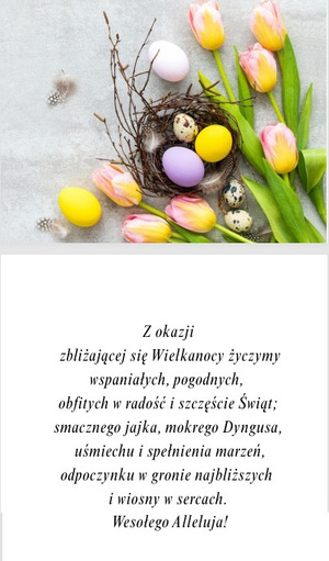 Na tegoroczną Wielkanoc, wszystkim Państwu i Państwa Bliskim, w imieniu własnym oraz swoich zastępców, życzę pogody ducha, spokoju, odpoczynku, ale też uśmiechu i słońca.