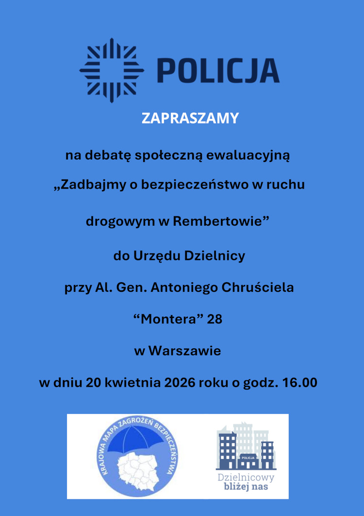 20 kwietnia 2026 roku o godz. 16.00 w Urzędzie Dzielnicy Warszawa Rembertów, przy ul. Gen. Antoniego Chruściela „Montera” 28 odbędzie się debata społeczna ewaluacyjna „ Zadbajmy o bezpieczeństwo w ruchu drogowym w Rembertowie, na której zostaną podsumowane realizacje wniosków zgłoszonych na debacie społecznej inicjującej w 2025 roku.