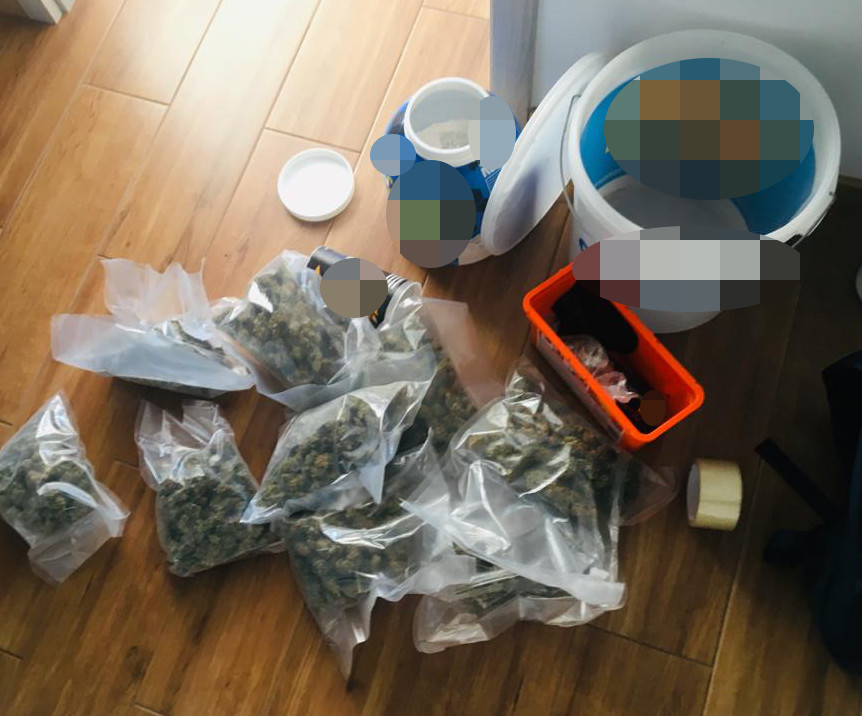 Podczas przeszukania, w szafie znaleźli wiadro plastikowe po farbie, w którym 25-latek przechowywał narkotyki. Mundurowi zabezpieczyli łącznie prawie 1000 gramów marihuany, ponad 130 gramów haszyszu, prawie 14 gramów mefedronu i 7 tabletek extasy. Mężczyzna został zatrzymany, trafił do policyjnej celi.